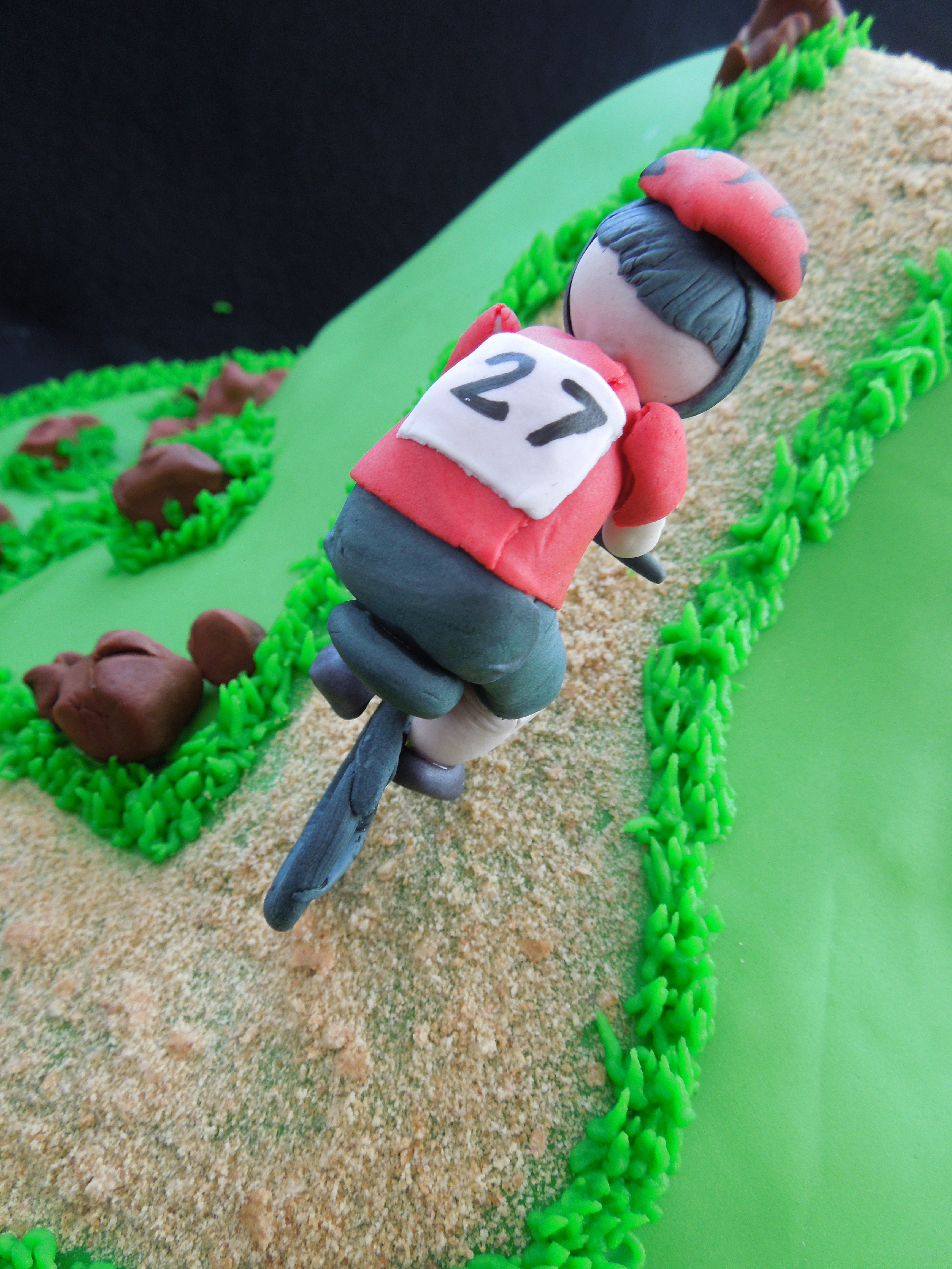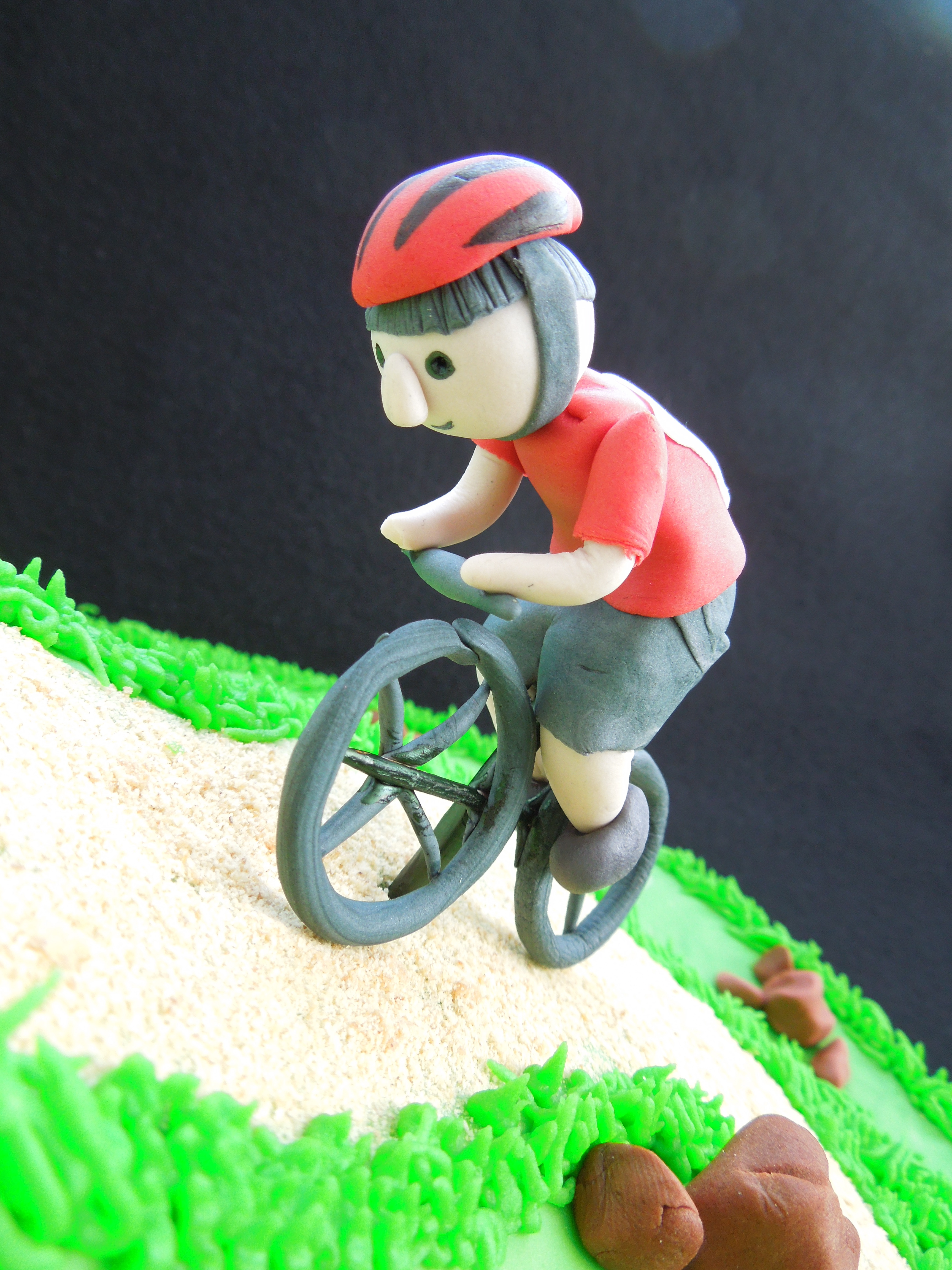 I created a bike rider cake for a friend who is into cyclocross. This provided me with #1, the opportunity to learn what that is, and #2, create the world’s cutest little fondant biker man!! Isn’t he adorable?!