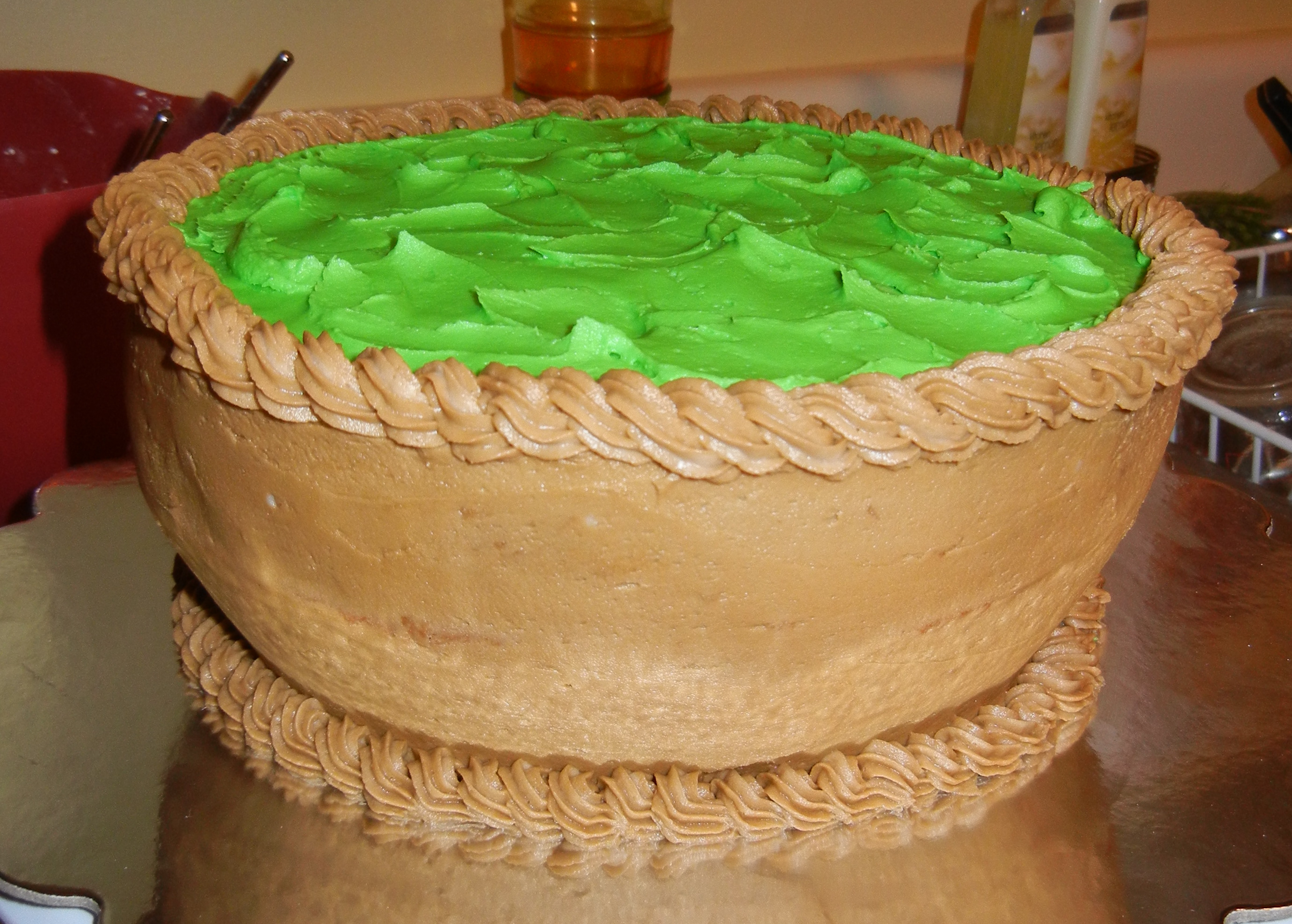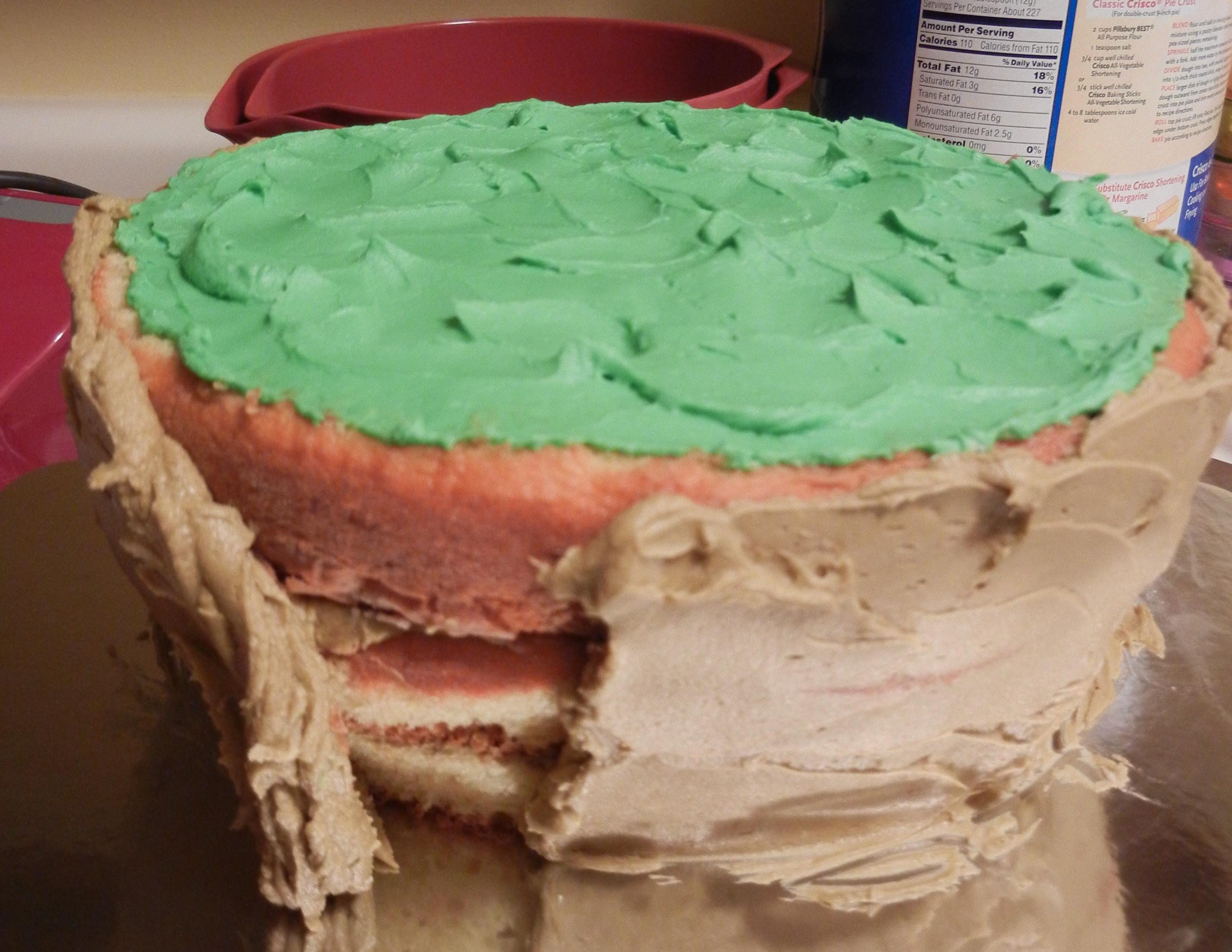 Once you’re ready to put it all together, it’s a cinch! This cake came together in less than an hour! Just stack a few rounds together, carve the bottom in a little (so that it looks like a bowl), and put on the frosting! Smooth the sides (I wanted to add a basket weave, but I didn’t have time) and then add a border on the top and bottom of the bowl.