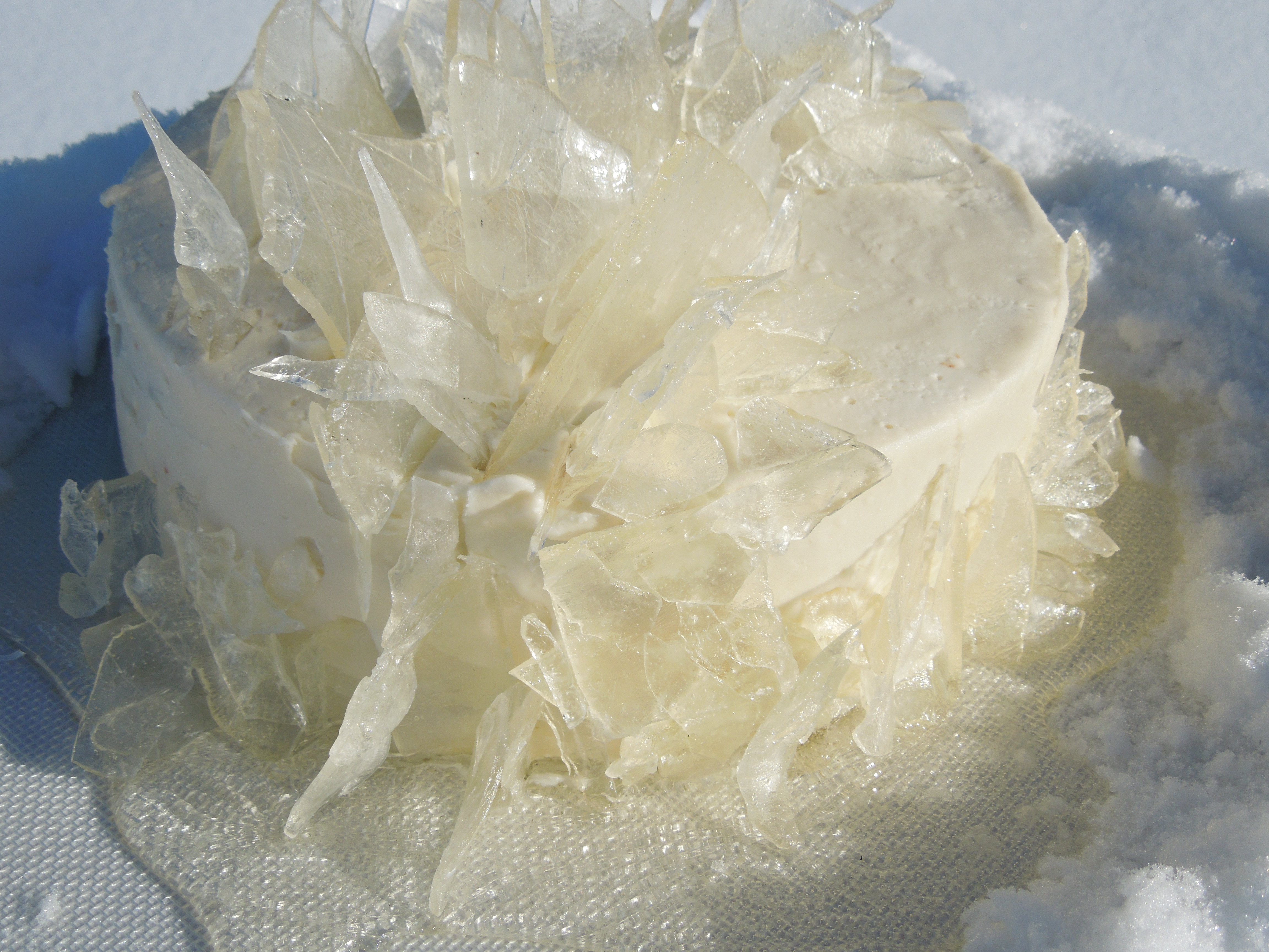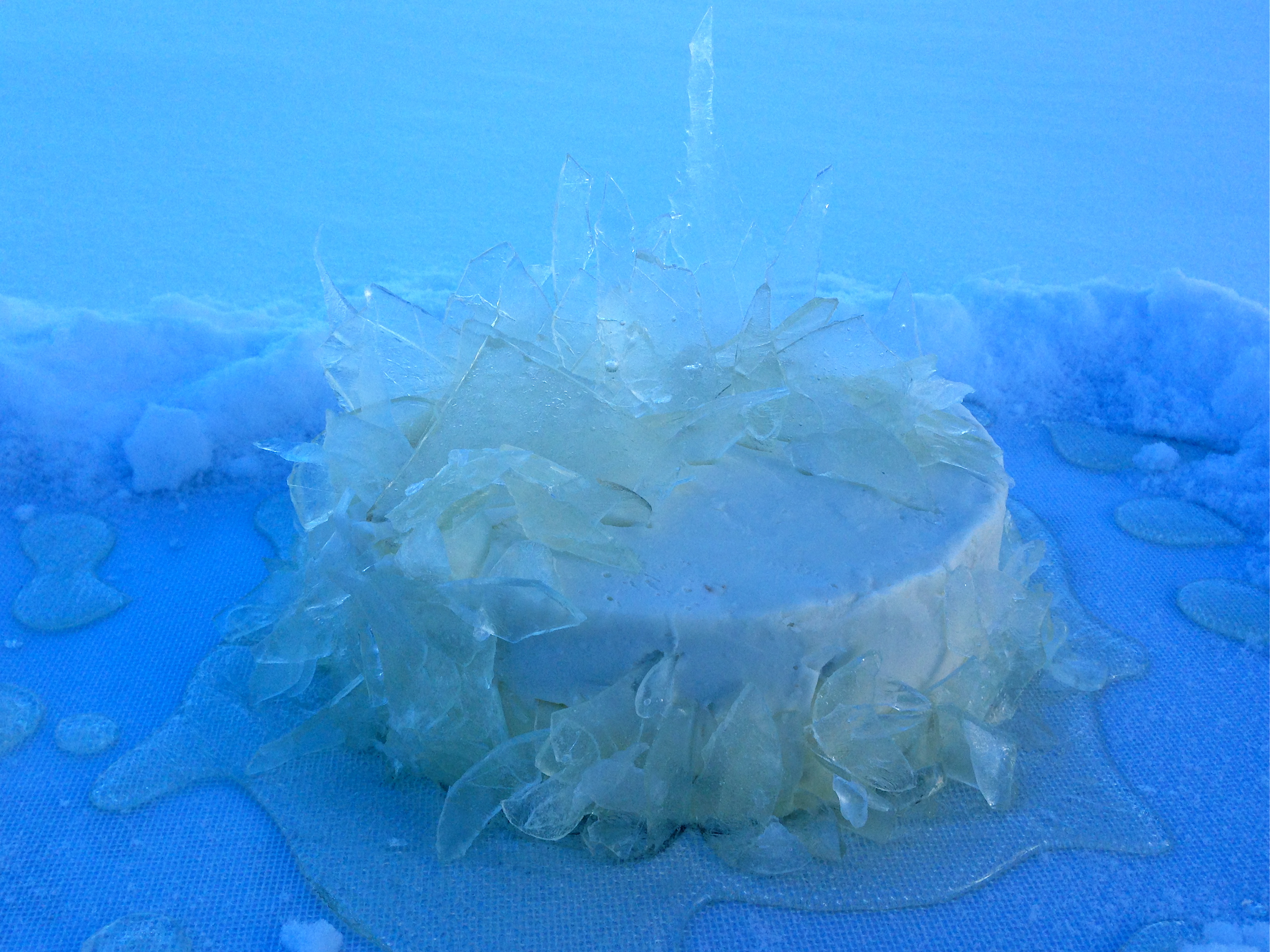 Well, this will definitely not work. I wanted a white cake to appear to be on a melting pile of ice. This cake would look like a pile of icicles sitting in a puddle of dog urine.