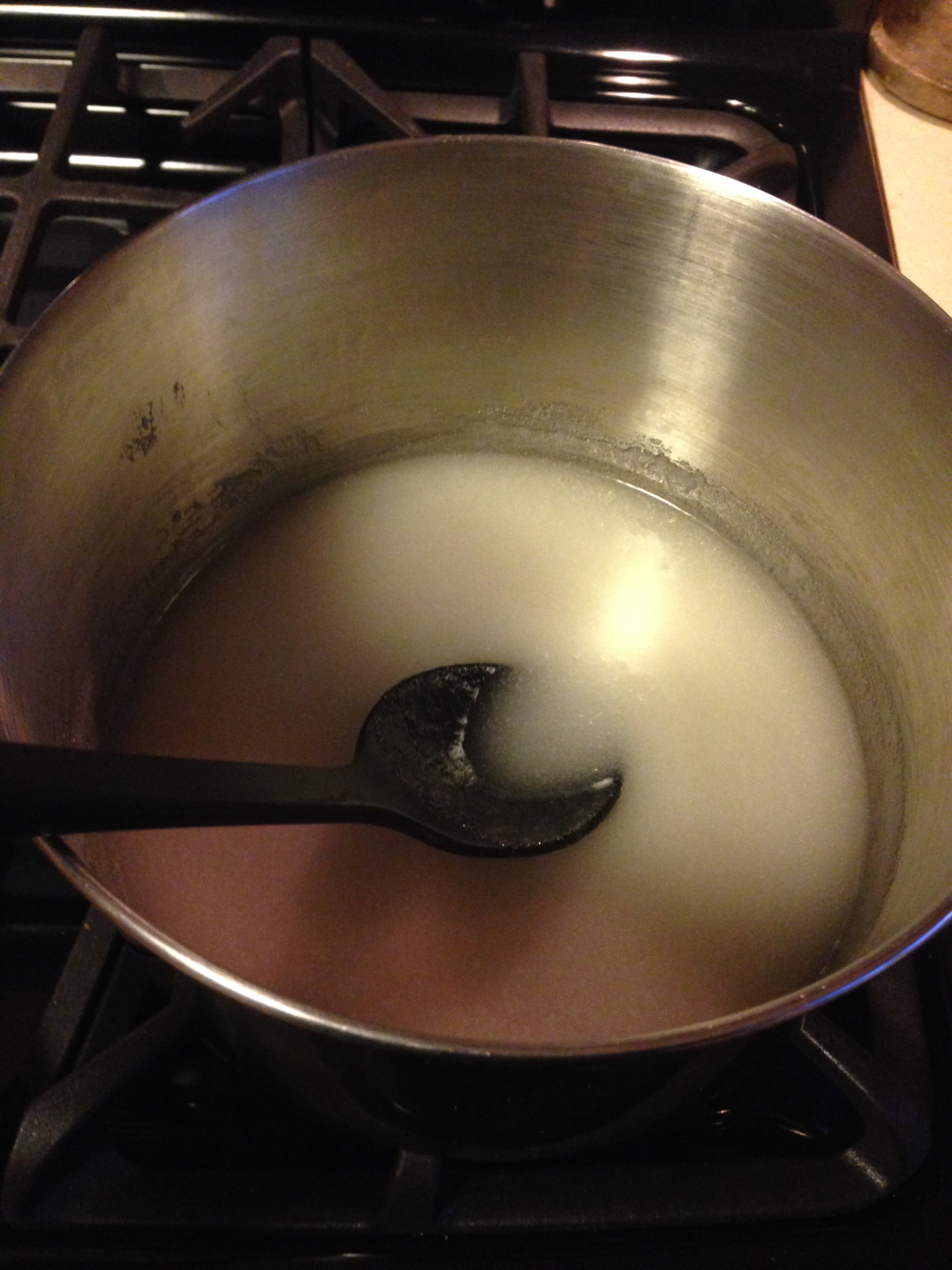And so, armed with neither the tools nor the training, I set to work. I decided to use this recipe, even though it meant I needed to do a little math since I don’t really know what a gram is exactly, and I don’t have a device that measures ounces. (And when I say I did math, what I mean is that I opened an app on my phone.) Here is the photographic journey of the sugar, water, corn syrup, and cream of tartar (“Yes, it’s different than tartar sauce, Kath,” promised my mom).