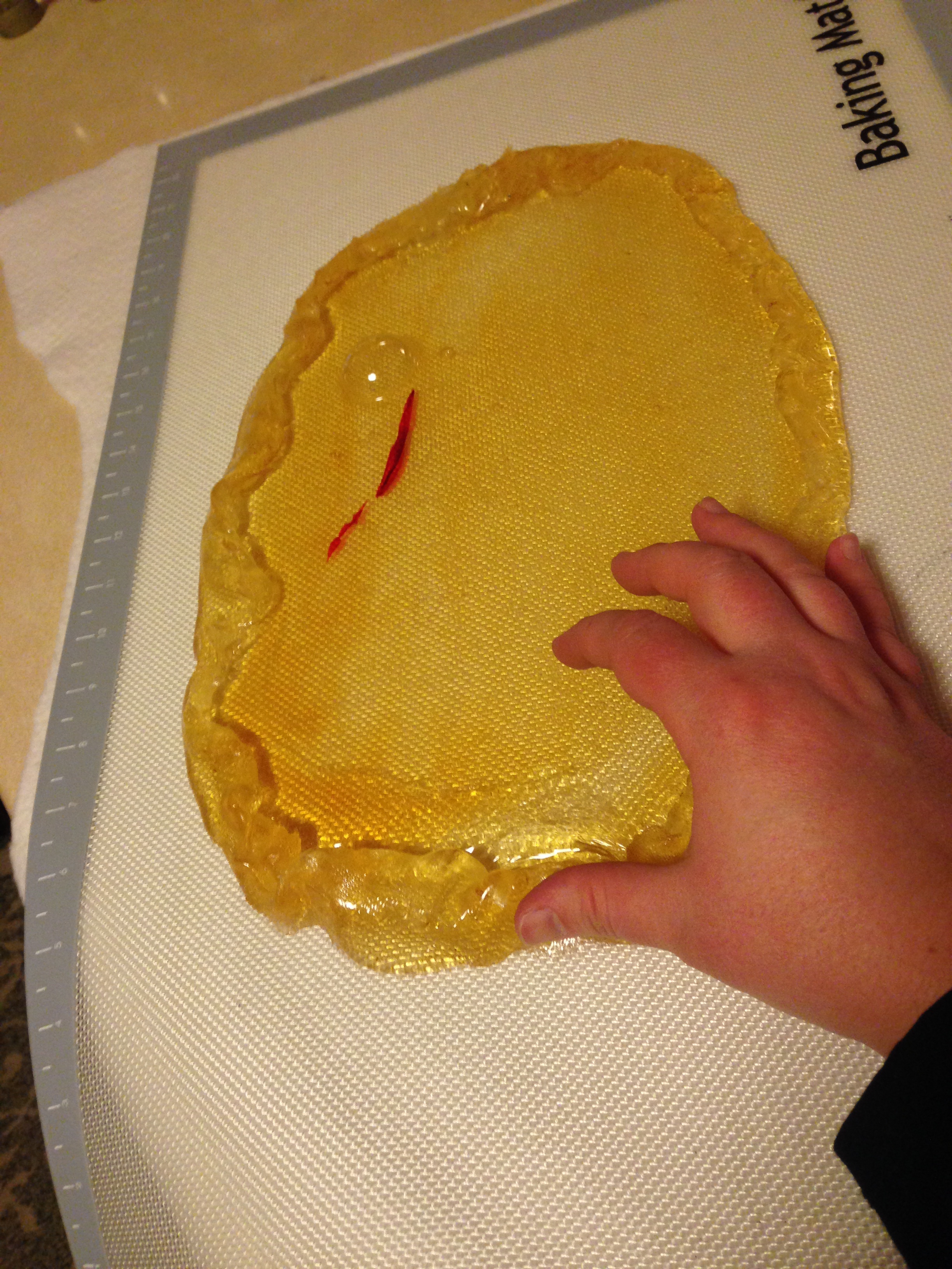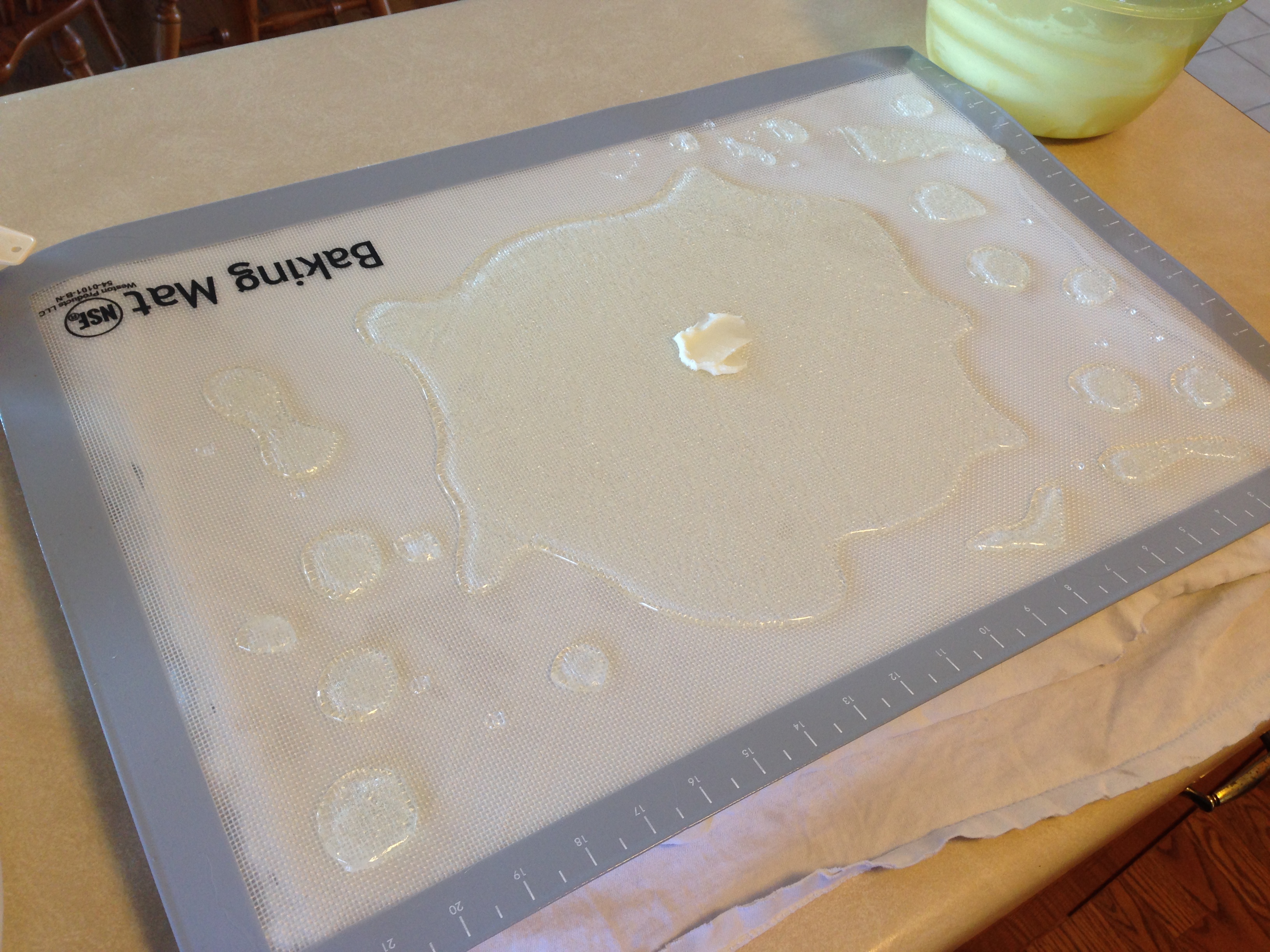 e various videos that one should slowly roll up the edges (it’s reeeeally hot so you must be careful!!) and eventually it will form one large ball that can be pulled and molded into flowers or other decorations. One is supposed to have a marble slab under the baking mat (hm, fresh out of marble slabs… how about some of my mom’s extra batting material?) and one is supposed to wear gloves, both for physical protection and also to protect against fingerprints in the finished product. (Don’t have those either.)