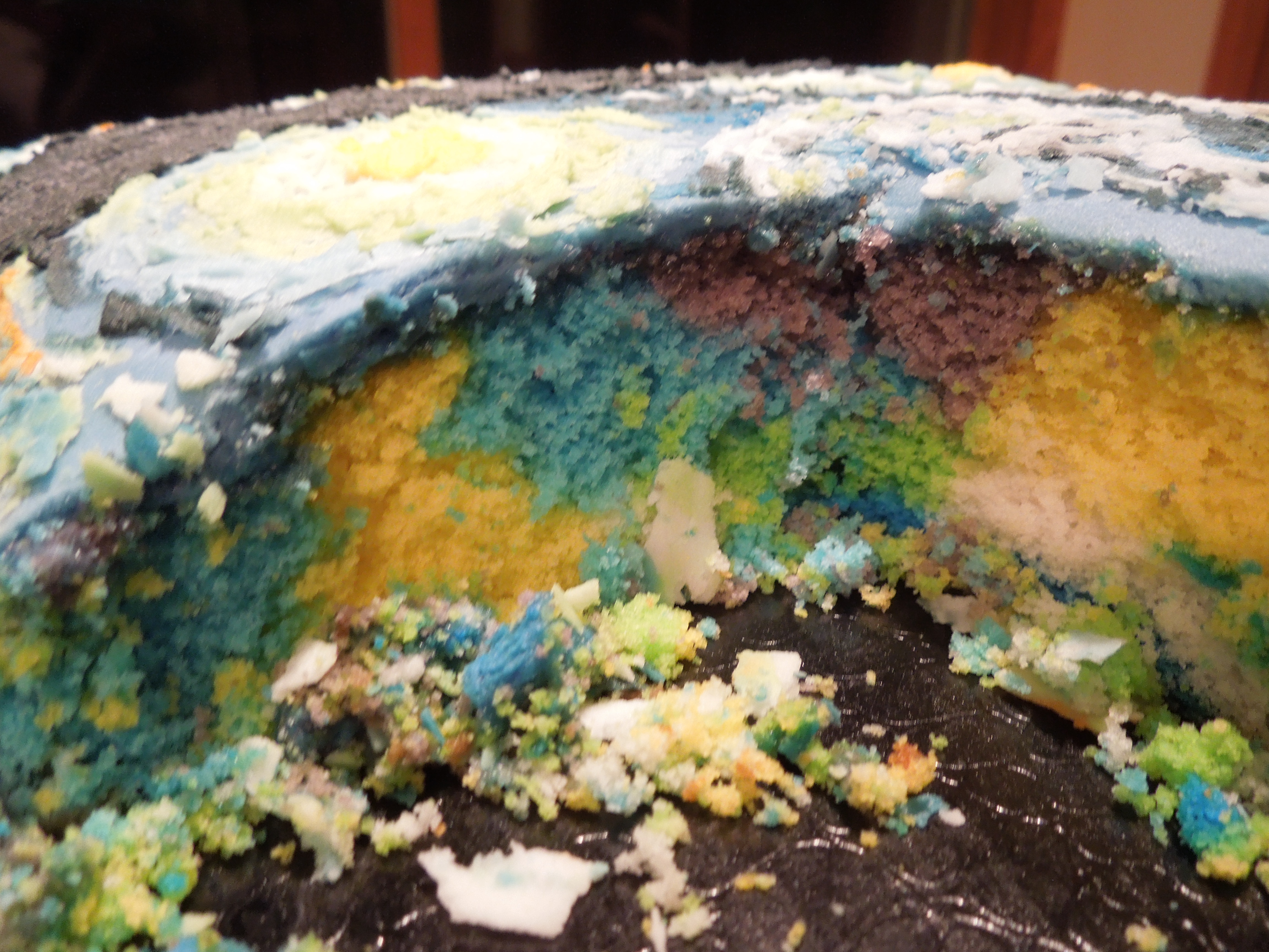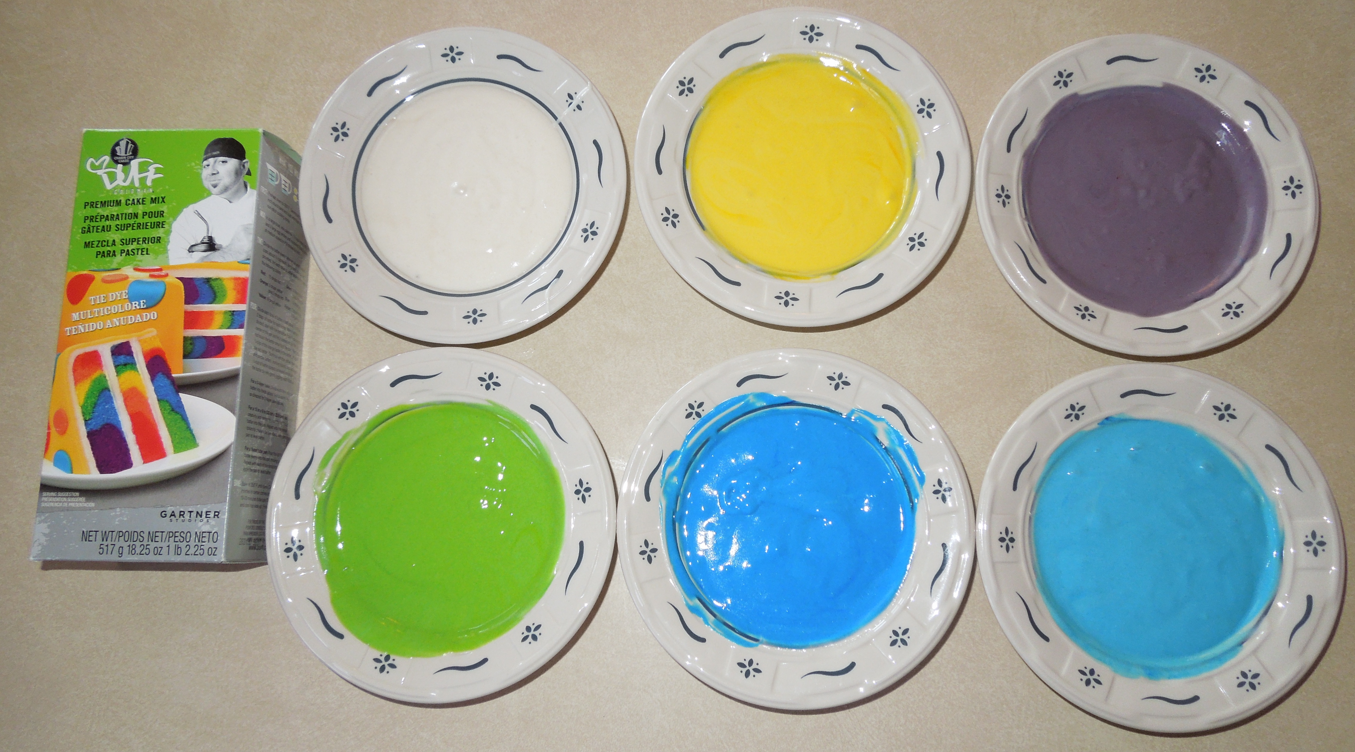 First thing’s first: the cake! I wanted the “dab” effect to run throughout the cake, rather than just on the surface, so I purchased a Duff tie-dye mix. The mix comes with lots of colors, but I didn’t use the reds (since there are no reds or oranges in the Van Gogh).