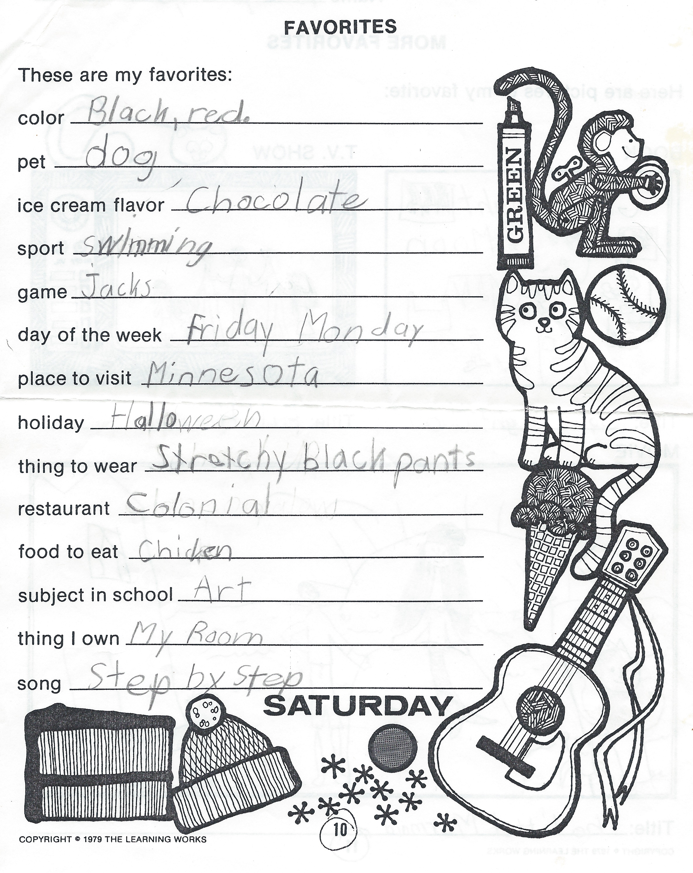 (Side note!! If you zoom in on this worksheet, I just realized you can see that my (fabulous) choice of “stretchy black pants” was actually covering a previously erased answer, “School U-” I’m gonna guess that was going to say, “School Uniform.” Nice to know I was already a full-blown nerd at age eight. The only person alive who liked Catholic school uniforms.)