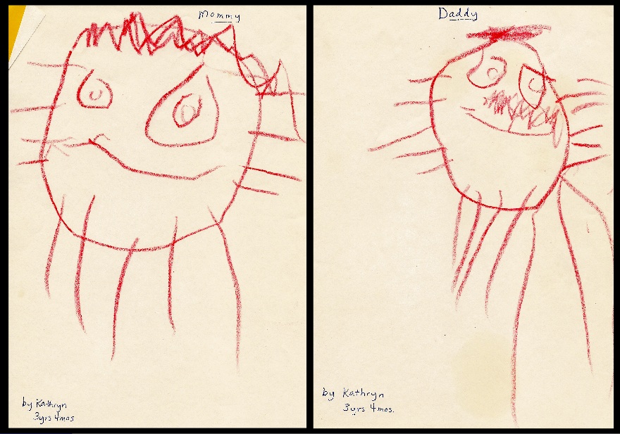 Anyways: crayons, colored pencils, paint, play dough- you name it, I played with it. My mom even kept some of my first drawings, as you can see below! Though missing some important features (like bodies), the most notable thing of all was included: my dad’s fantastic mustache.