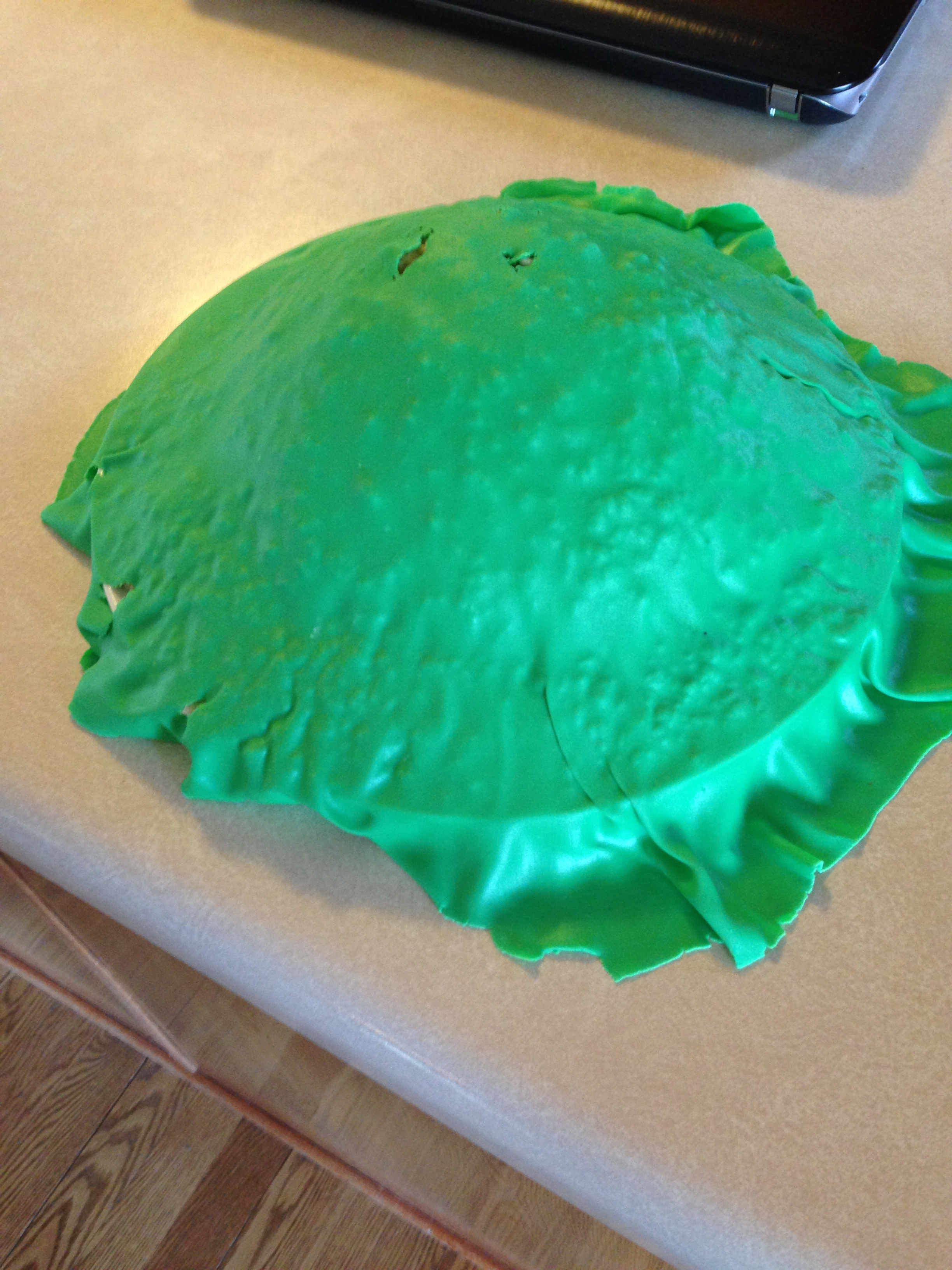 Next, we created a base for the tree. This tree was going to be very heavy, so we decided to use rice krispie treats instead of cake! Cover the base in fondant, and trim off excess fondant: