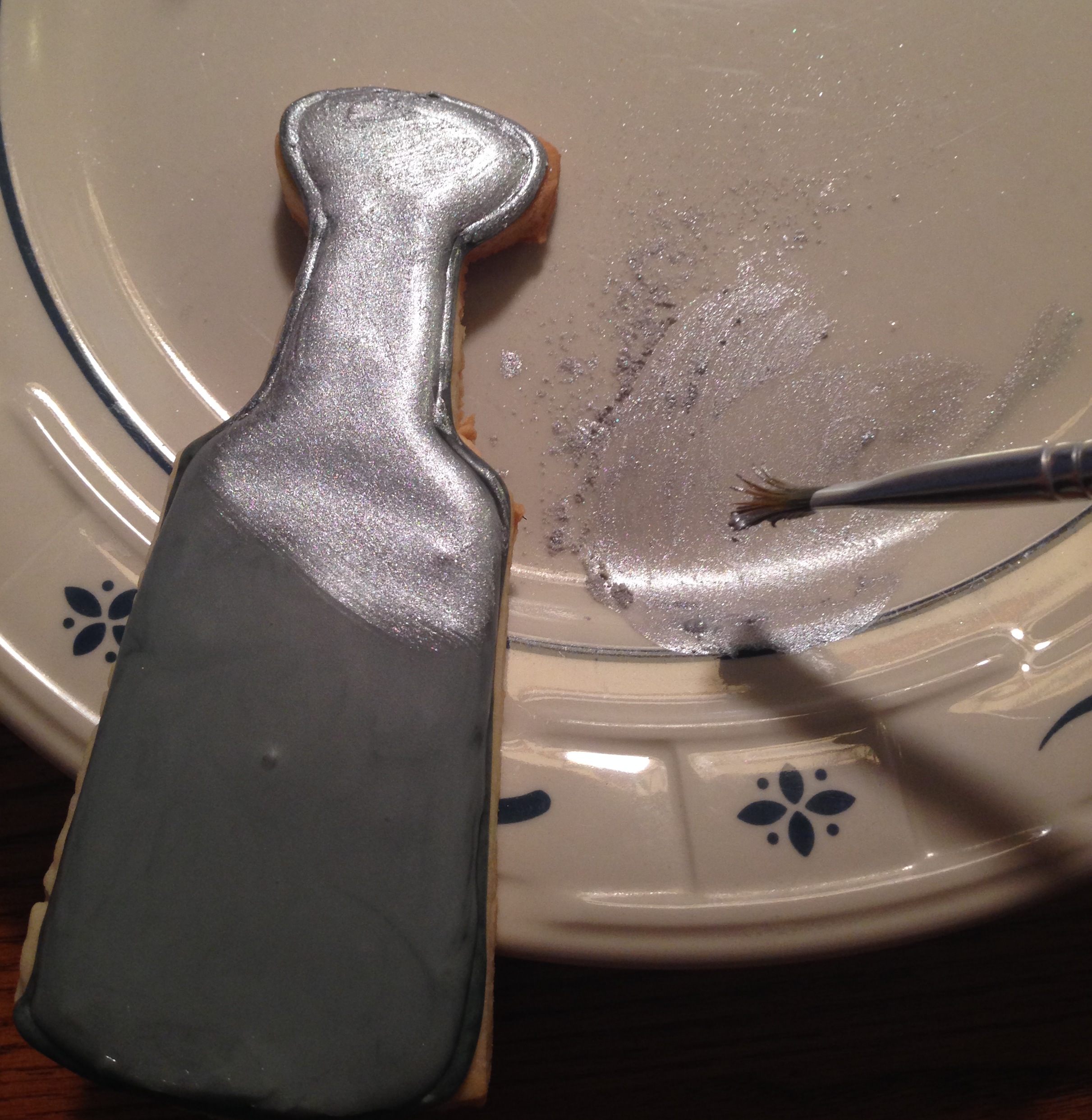 The top cookie on this “One Goal” hockey tree is the Stanley Cup. I don’t own a cutter for this so I tried to eyeball it. I covered the cookie in gray royal icing, but what a huge difference a little luster dust makes! They make metallic dusts in a variety of colors. And a little goes a long way! Simply mix with a splash of lemon extract and paint it right on.