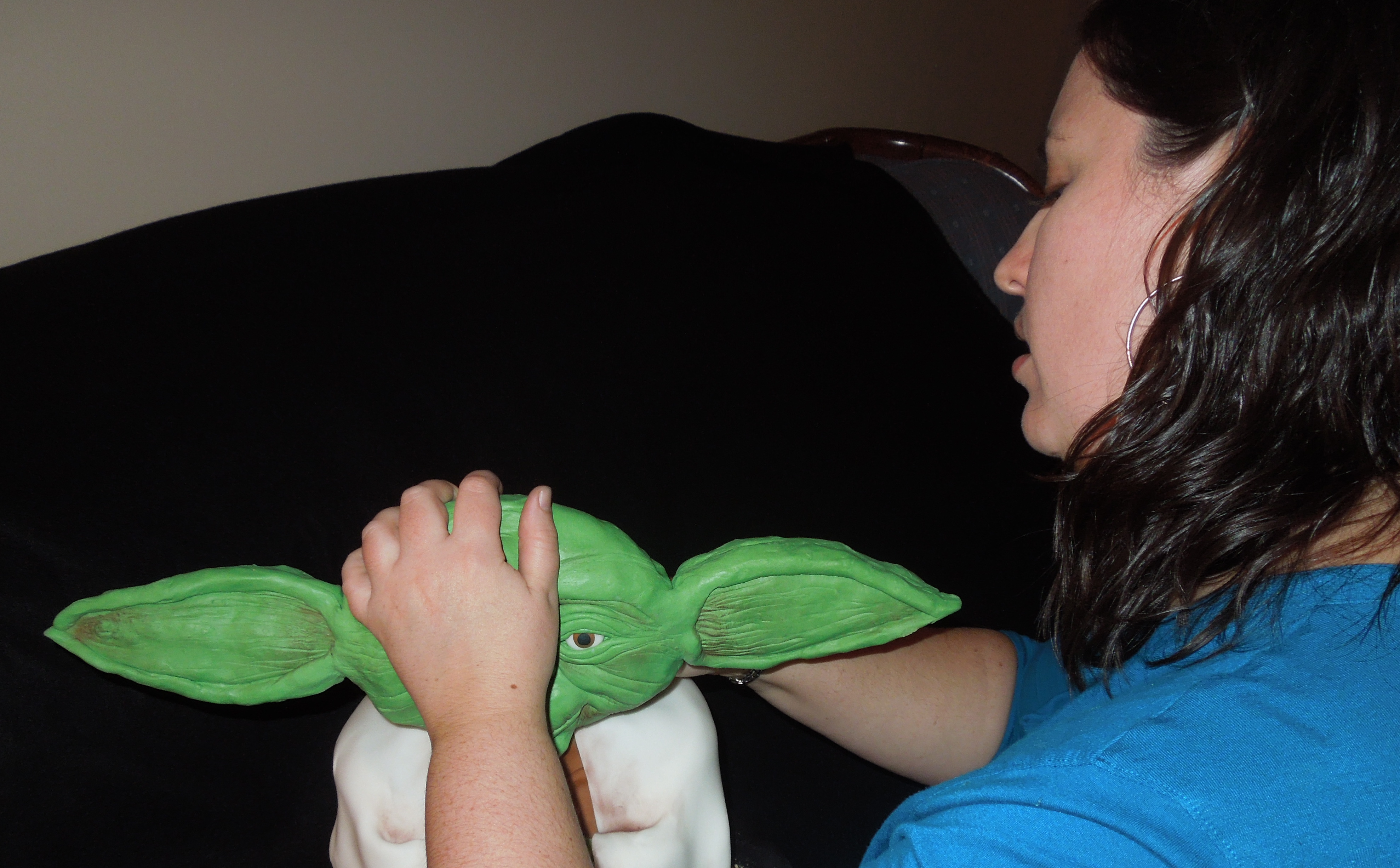 I took the supplies back to my parking space and squatted next to the car. Handful by handful, I tossed chunks of cake and green buttercream into the plastic bag. I dampened some paper towels and then attempted to wipe off the frosting around the edge of the cake base. Wetting fondant is not a good idea because it causes it to get sticky and it also leaves a sheen, but it was better than leaving the green everywhere, I thought.