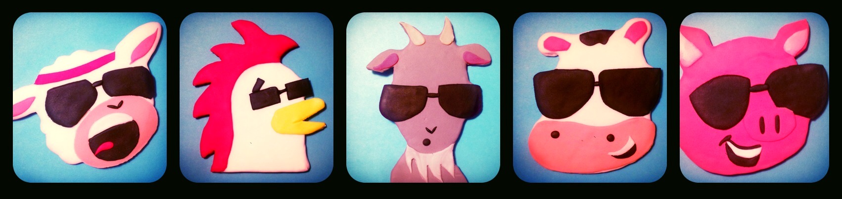 3. Once the base color of fondant was attached to the cardboard, I flipped the face over and added all the features, like sunglasses, hair, mouths, etc. Since I had a photocopy of the drawings I had made, I knew how big to cut these features. Here is a photo of each fondant-covered animal: