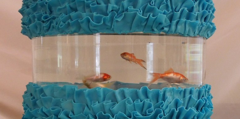 About a year ago, I came across a gorgeous terrarium that just happened to be the exact size of a round cake. “I must have this,” I said resolutely, “and shall someday fill it with something important.” A few months later, when my sister’s tropical bridal shower was announced, the wheels clicked into place. “Fish! I shall fill it with exotic and beautiful fish of every color, and put a cake on top of it!”